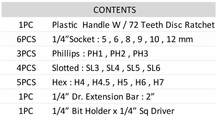 Pesquisa Avançada 1/4" 3/8" 1/2" 3/4" 1" 1-1/2" Casa » FERRAMENTAS PNEUMÁTICAS » FERRAMENTA DE MÃO » Série de bits » Ratchet Bit Sets » 21PCS 1/4” 72 Teeth Disc Ratchet Bit Set 21PCS 1/4” 72 Teeth Disc Ratchet Bit Set modelo : BS915 quantidade : Add To Inquiry Especificações BS915 21PCS 1/4” 72 Teeth Disc Ratchet Bit Set Related Products 10PCS 3/8 "Tamperproof Stubby Bit Setmodelo : BS05210THBC Add To Inquiry 180° Tool Case Color BIT & Socket Set (33PCS)modelo : SC0033K Add To Inquiry Color Ring Socket Bits Set (20PCS)modelo : SC02520K Add To Inquiry 14 PCS Flexible Professional Screwdriver Setmodelo : FLS2 Add To Inquiry 33PCS Bit & Socket W/Half Moon Ratchet Handle Setmodelo : BS7033S5 Add To Inquiry Screwdriver Nuts And Bits Set (42PCS)modelo : SC00142GB Add To Inquiry